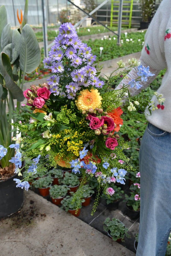 De foto dient als voorbeeld; elk boeket wordt vers samengesteld en kan licht verschillen.